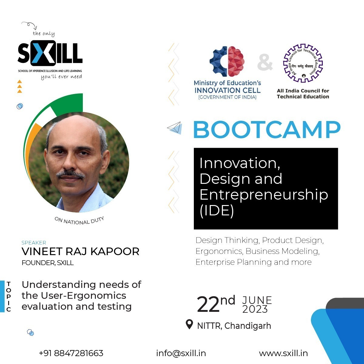 SXILL/ Chandigarh Design School Founder, Vineet Raj Kapoor has been invited by Ministry of Education, Govt of India, to conduct a session on “Understanding needs of the User-Ergonomics evaluation and testing” on the 1st Day of the Bootcamp on 22 June 2023 at NITTR Chandigarh. AICTE and Ministry of Education’s Innovation Cell (MIC) are jointly organizing Five day Bootcamp on “Innovation, Design and Entrepreneurship (IDE)”. This bootcamp is conceptualized based on suggestion from Hon’ble Prime Minister Shri Narendra Modi and it is tentatively scheduled from 22nd June to 26th June 2023 at 6 locations i.e IIT Bhubaneswar, NITTTR Chennai, NITTTR Chandigarh, IIT Guwahati, IISER Bhopal and COEP Technological University ,Pune