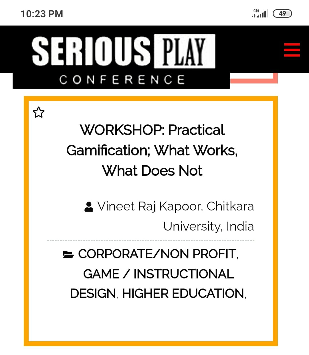 Mr. Vineet Raj Kapoor will be taking workshop on Practical Gamification: What Works, What Does No at Serious Play Conference.