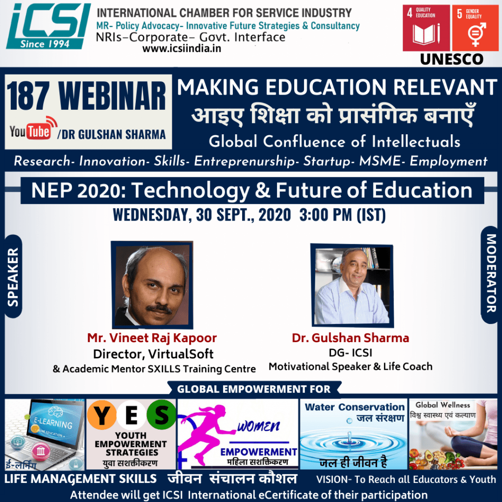 ICSI (International Chambers of Service Industry) invited Vineet Raj Kapoor to present a seminar on the National Education Policy 2020, and about making education relevant. Vineet Raj Kapoor, highlighted the positives of the new education policy and also gave additional suggestions to make the implementation feasible.